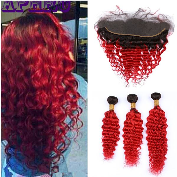 2019 1b Red Deep Wave Bundles With Lace Frontal Brazilian Virgin Human Hair Dark Roots Red Hair 3 Bundles With 13x4 Lace Frontal Closure From