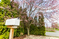 Mail Box In Springtime Cherry Blossom Tree At Front Yard Near